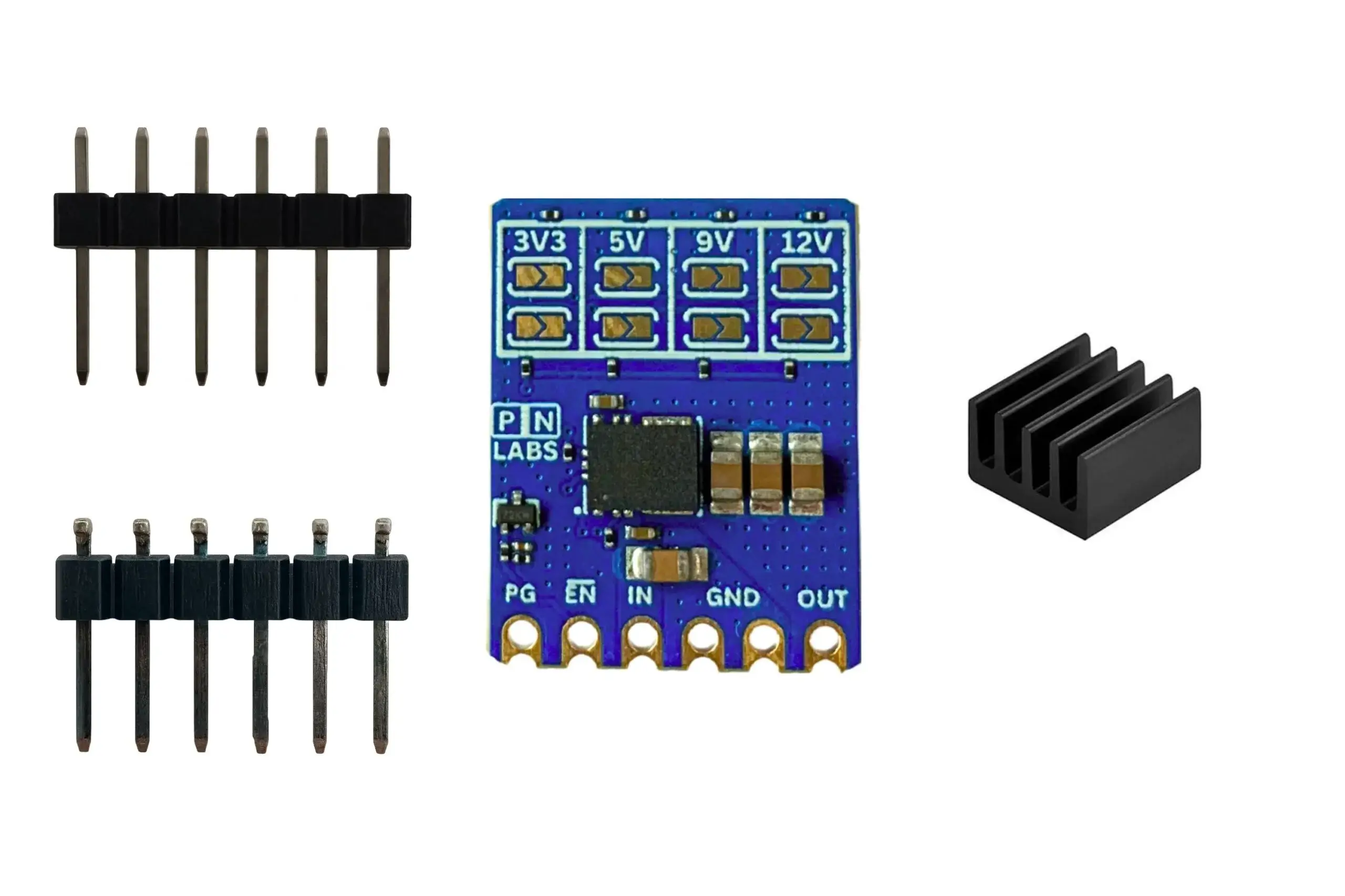 Adjustable step-down regulator 4.5-36 V input with selectable fixed voltage outputs of either 3.3, 5, 9 or 12 V. Up to 2.5 A of continuous current.
