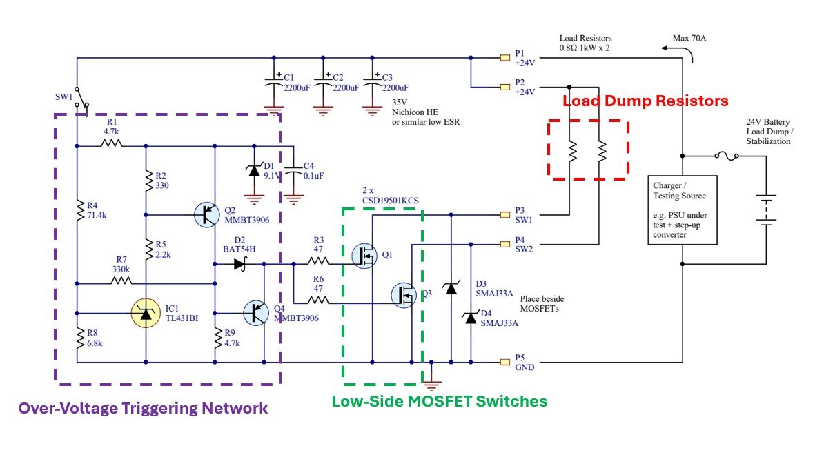Here’s a load dump circuit created by Tim Williams from Seven Transistors Labs that is annotated for clarity [2]: