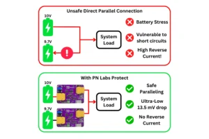 Ce flux de courant incontrôlé peut endommager les alimentations qui ne sont pas conçues pour gérer cela, car la boucle de contrôle interne essaiera maintenant de compenser ce que fait l’autre alimentation. Dans le cas d’une batterie, un pic de courant non régulé et potentiellement dangereux circulera, ce qui peut augmenter le courant de charge maximal de la batterie, l’endommageant ainsi en plaquant du lithium sur l’anode et contribuant à une défaillance précoce.